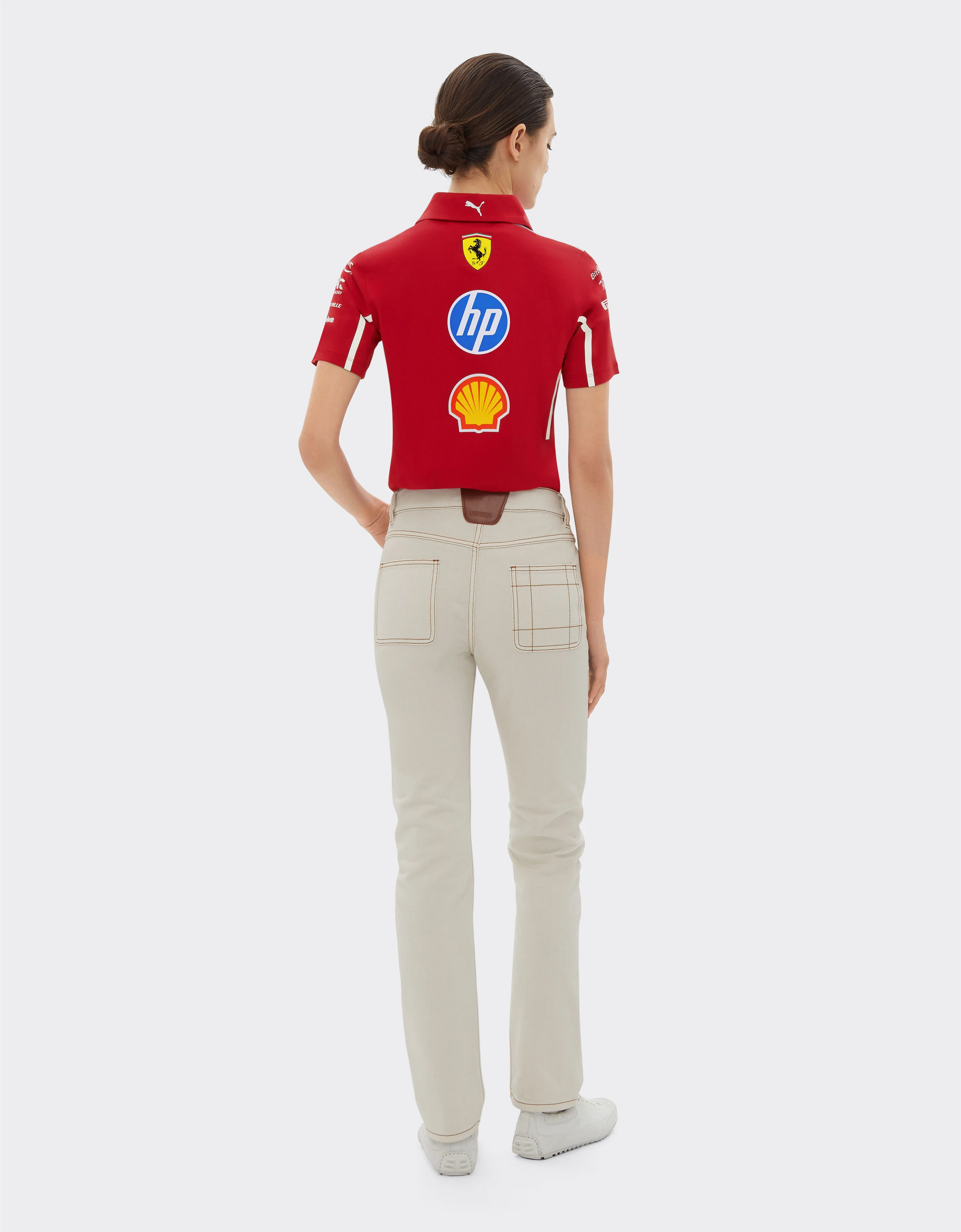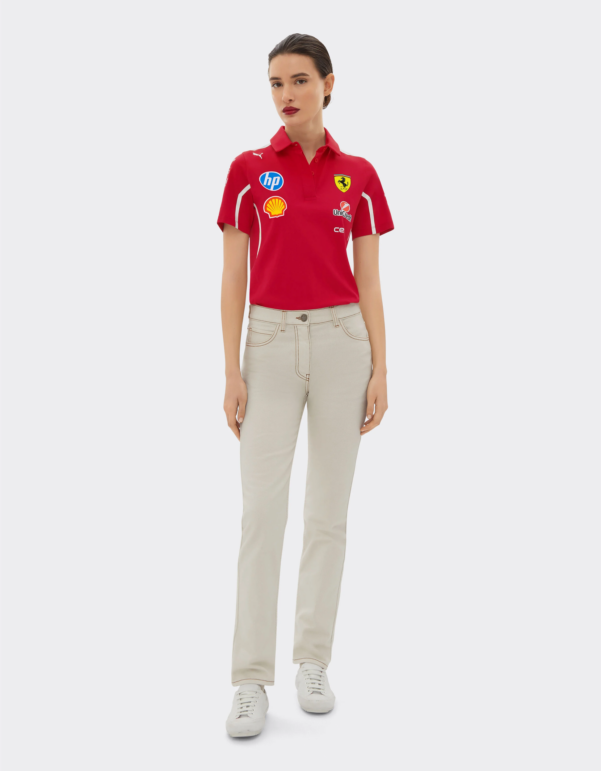 La polo femenina del equipo de 2025 de la Scuderia Ferrari de PUMA resulta reconocible porque es como el que llevó el equipo y los pilotos Lewis y Charles toda la temporada 2025 de Fórmula 1. Una polo entallada para mujer en el rojo de la Scuderia Ferrari 2025, de manga corta y con las marcas oficiales de Ferrari y PUMA